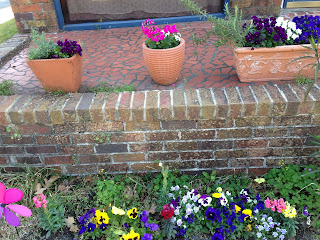I planted flowers this year!! I love to plant flowers, but I have not had the time to do it in recent years. I have lots of pansies and violets, and they are very pretty. I LOVE THEM!! I got all sorts of colors, too. I went to the dollar store one day and found some cute little pinwheels, so I put them in the garden and on the walkway to the house. They blow furiously in the wind!